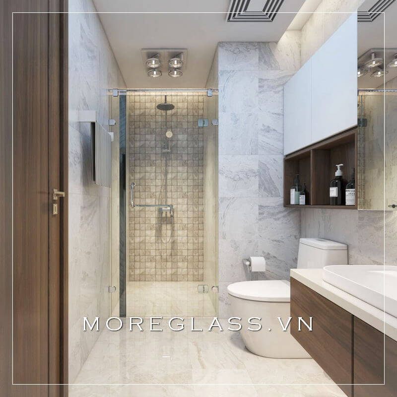 Mẫu thiết kế phòng tắm nhỏ gọn với nội thất tối giản, tiện nghi, sử dụng gạch ốp tường và gạch lát nền màu trắng vân may cao cấp cuốn hút mọi ánh nhìn