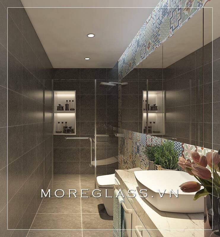 Không gian phòng tắm nhỏ nhưng được thiết kế theo phong cách hiện đại. Bạn sẽ bắt gặp phong cách này tại các khu chung cư, căn hộ nhà biệt thự và nhà phố.