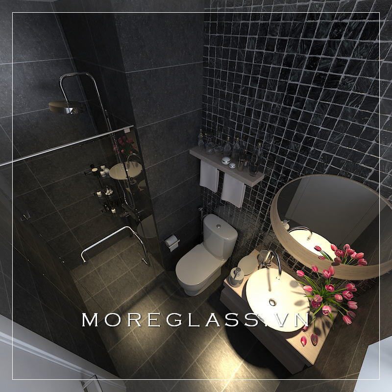 Mẫu thiết kế phòng tắm chung cư nhỏ đẹp, nổi bật với gạch ốp màu đen xám đầy cá tính kết hợp nội thất tiên nghi mang đến không gian thư giãn tuyệt vời