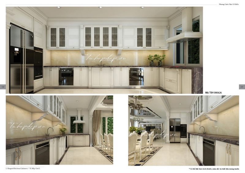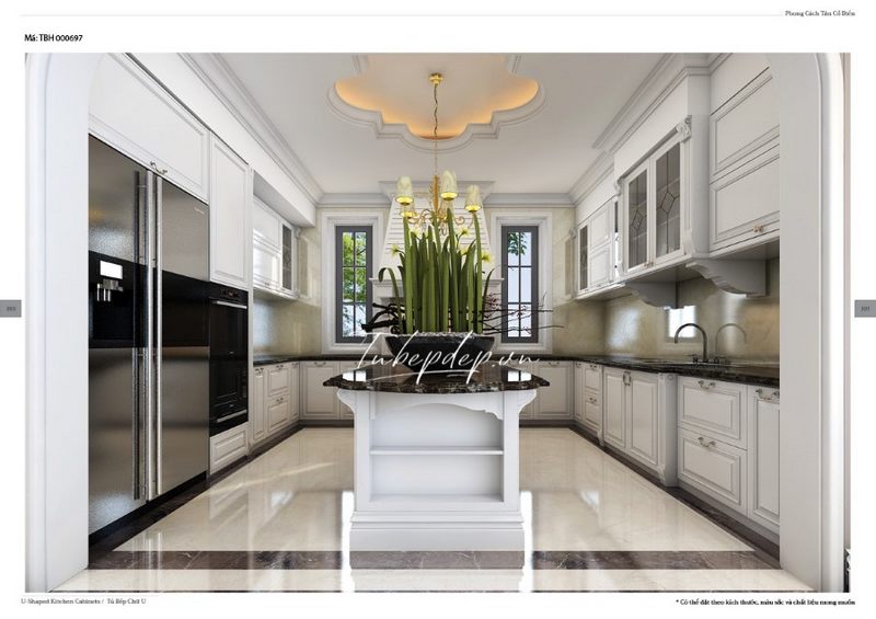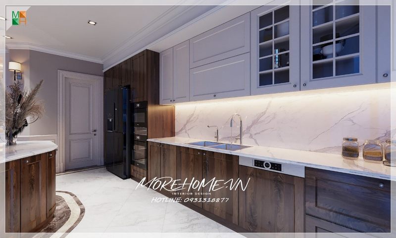 Màu trắng trẻ trung hoàng gia của mẫu tủ bếp tân cổ điển đã khiến căn bếp của biệt thự, nhà phố trở nên cao cấp và rộng rãi hơn.