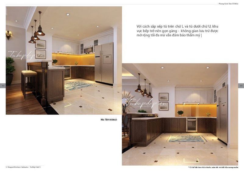 Một mẫu thiết kế phòng bếp tân cổ điển được tạo ra bằng cách kết hợp sáng tạo giữa tủ bếp chữ L trên và tủ dưới chữ U từ gỗ óc chó, mang lại sự sang trọng và tiết kiệm không gian, có thể cất trữ được nhiều đồ hơn.