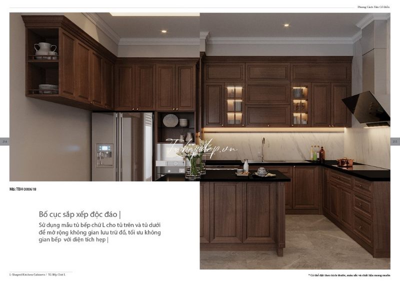 Bố trí phòng bếp với nội thất gỗ óc chó cùng các chi tiết tủ bếp tân cổ điển được cách điệu và tối giản để tránh bí bách. Màu nâu trầm tạo ra sự sang trọng cho không gian.