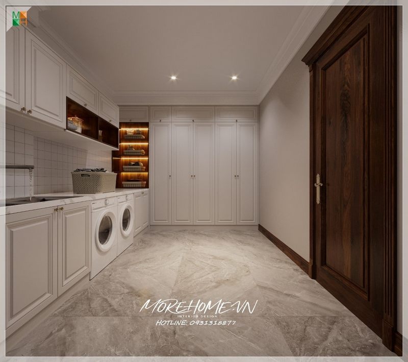 Để tạo ra một không gian phòng giặt đồ đẹp, hãy thêm vào một cánh cửa gỗ óc chó tân cổ điển với độ bền và thẩm mỹ cao.