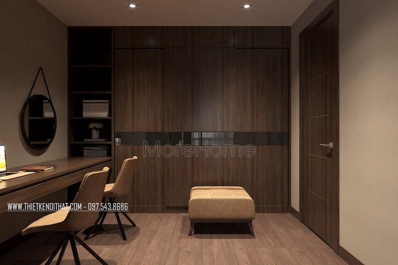 Gia chủ đã chọn mẫu cửa gỗ công nghiệp An Cường với gam màu nâu cánh gián để làm cửa phòng ngủ, nhờ đó nó nổi bật.